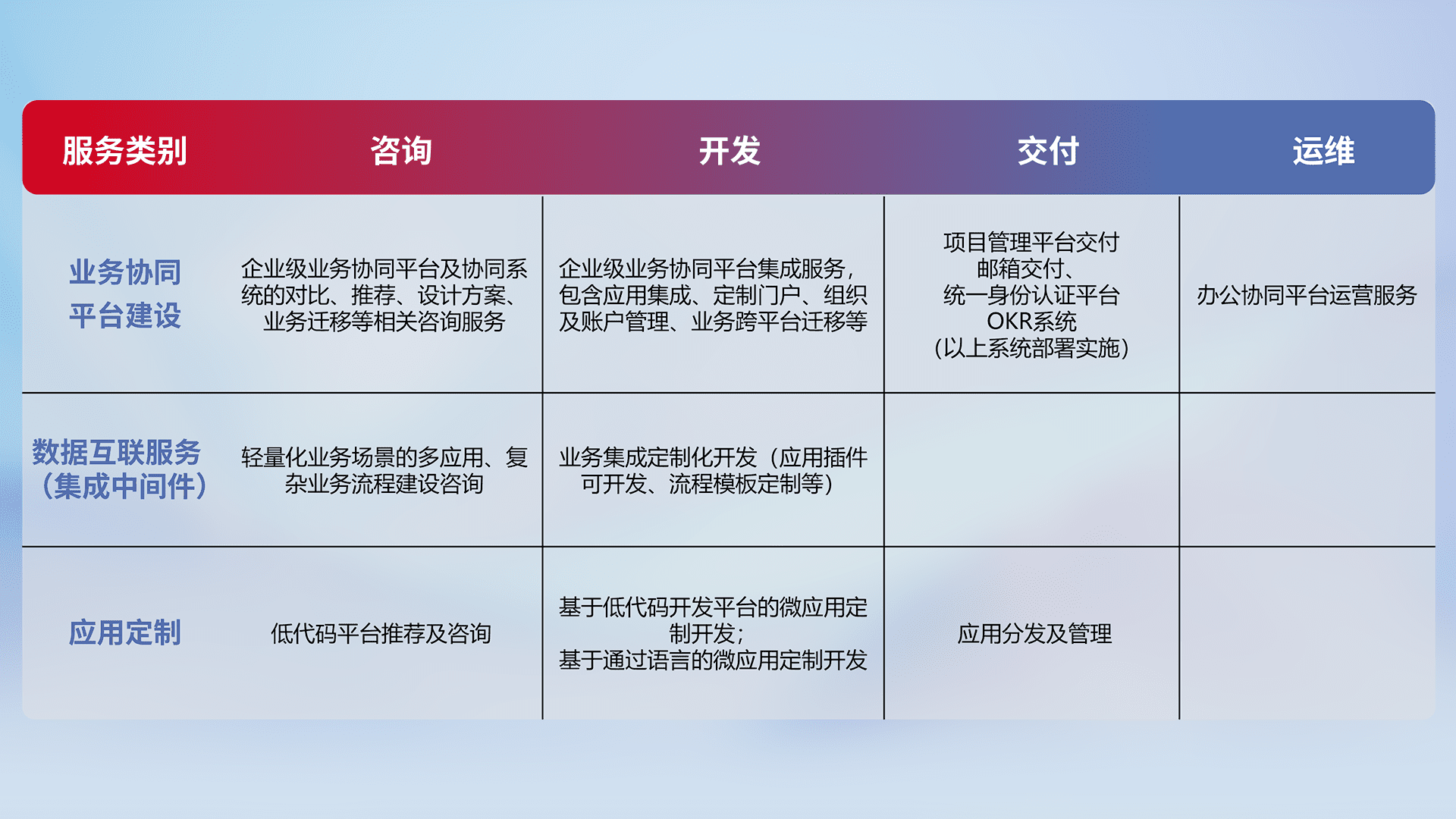 针对钉钉、、、、企微、、、、IDaas等平台级产品提供产品的规划、、、方案、、交付、、、、定制化开发等服务,,,实现如统一协同办公、、、智能客户服务、、混合会议管理、、、智能数据查询、、、、等业务场景,,实现数字化转型。。